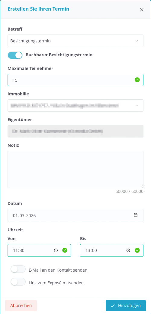 Einen buchbaren Besichtigungstermin erstellen Sie wie einen regulären Besichtigungstermin im Kalender.